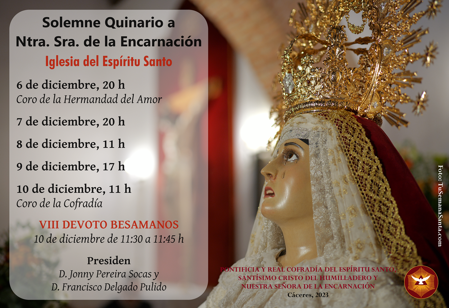 La Cofradía celebra el Solemne Quinario a Nuestra Señora de la Encarnación del 6 al 10 de diciembre de 2023 en la iglesia parroquial del Espíritu Santo con el siguiente programa: