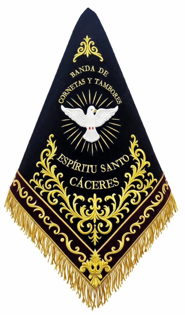 Sobre terciopelo negro, lleva bordado en oro el nombre de la formación «Banda de · Cornetas y Tambores · Espíritu Santo · Cáceres», con el emblema de la Banda en el centro. Se completa el conjunto con bordados en oro a base de hojarasca. La parte inferior lleva los bordados sobre terciopelo granate. Fue realizado por el Grupo BordArte de Don Benito (Badajoz) y estrenado en 2026 con motivo del X aniversario fundacional de la Banda Infantil. Hasta esa fecha, empleó el que había sido utilizado por la Este guion fue utilizado por la Banda de Cornetas y Tambores «Santísimo Cristo del Humilladero» hasta de 2004 a 2016.