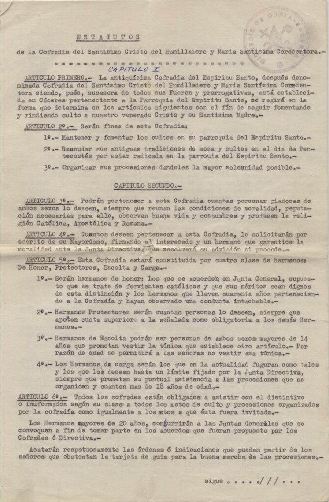 Desde 1950, pues, la Cofradía retoma sus actividades, toma acuerdos, elige a distintos Mayordomos, adquiere insignias e imágenes y vive en un espíritu de hermandad penitencial, como otras cofradías cacereñas. En el acta de 16 de febrero de 1962, al momento de elegir a D. Antonio López-Montenegro y García-Pelayo como Mayordomo, el Secretario de la Cofradía, D. Francisco Sánchez Pizarro, informa a los hermanos de que «se debe hacer conforme determinan los Estatutos, pero en nuestra Cofradía por no tener confeccionados los mismos y con el fin de contar cuanto antes con la persona que llevará la dirección de la Hermandad, en este caso la elección se hará como sigue» (Archivo de la Cofradía del Espíritu Santo, Gobierno, Actas y acuerdos, Acta de 16 de febrero de 1962), siguiendo la explicación del método de elección. Así pues, en ese año la Cofradía todavía no contaba con unos estatutos, lo que no le impedía funcionar, como se ha dicho; incluso constan en el Libro de Cuentas de la época varias Visitas Pastorales.