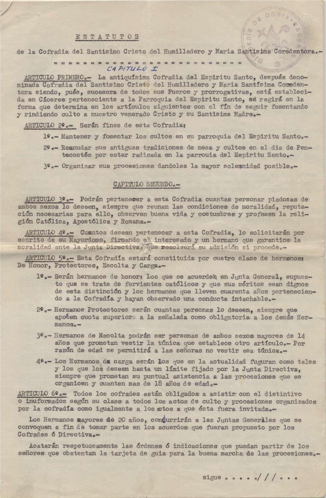 Los primeros Estatutos de la etapa penitencial fueron aprobados por el Obispo de Coria-Cáceres, D. Manuel Llopis Ivorra, el 19 de diciembre de 1972, siendo Mayordomo D. Andrés Pablo Muñoz. En el primer artículo se expresa que «La antiquísima Cofradía del Espíritu Santo, después denominada Cofradía del Santísimo Cristo del Humilladero y María Santísima Corredentora siendo, pues, sucesora de todos sus Fueros y prerrogativas, está establecida en Cáceres» (Archivo de la Cofradía del Espíritu Santo, Gobierno y Ordenanzas, Estatutos de 1972, pág. 1), viniendo a confirmar el acto refundacional que tuvo lugar en el ecuador de la vigésima centuria.