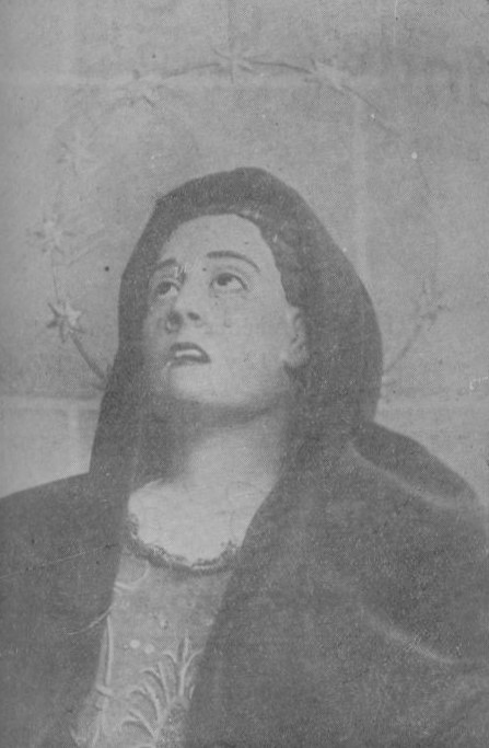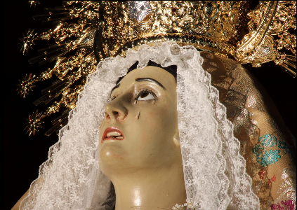 Las facciones no están idealizadas, sino que siguen el rostro realista de una mujer (se dice que el escultor se inspiró en la cara de su esposa). La expresión tiene cierta dureza debido al momento que está viviendo: se muestra con la boca abierta y los labios arqueados hacia abajo; también se ven los dientes. Implora al cielo ante el dolor por la muerte de su hijo con las manos totalmente abiertas. Tiene ojos de cristal que miran hacia arriba y de cada uno de ellos brotan tres lágrimas que no son de cristal (un detalle singular), sino de pasta de madera.