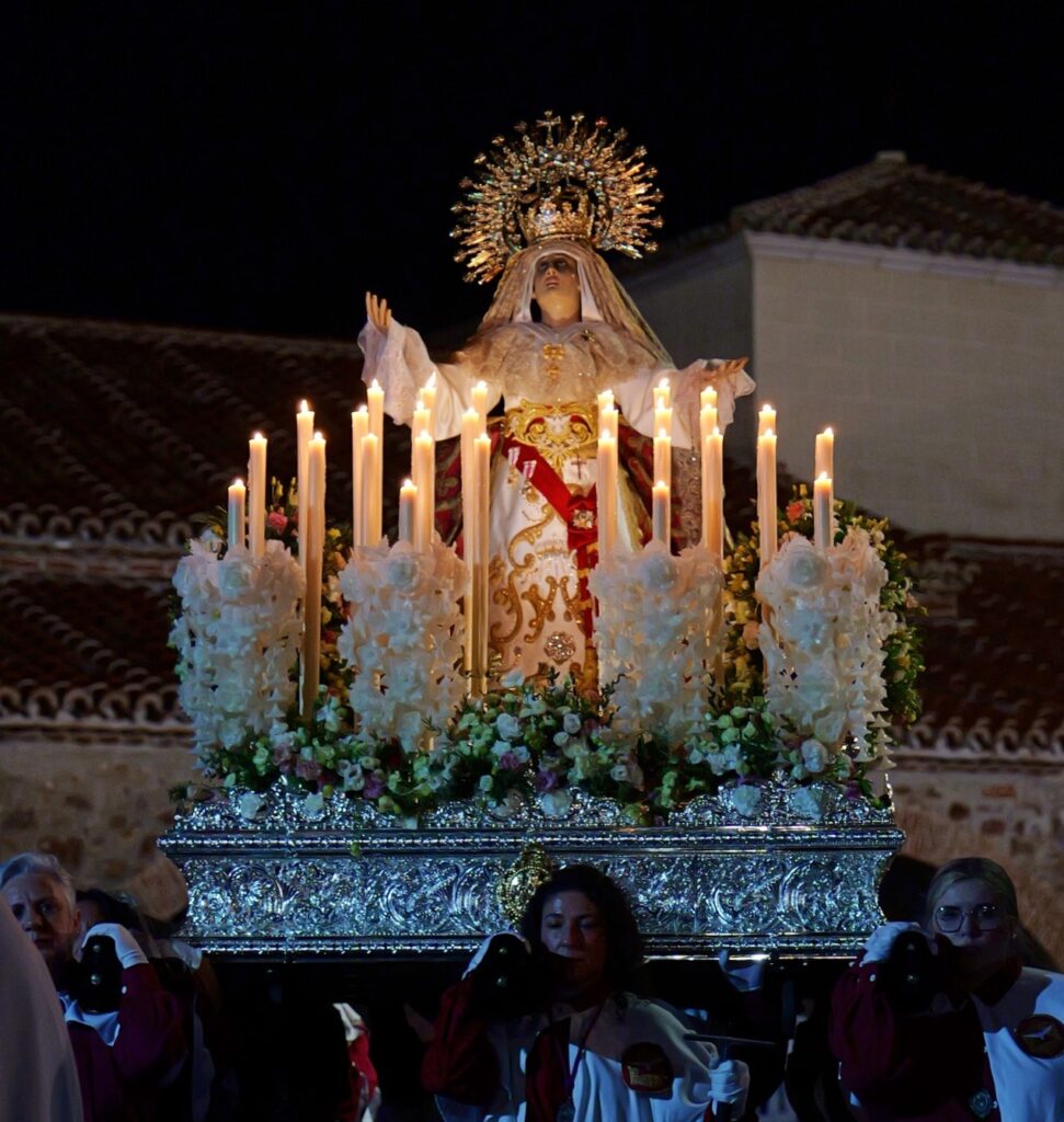 La imagen mariana desfiló por primera vez en 1960, y hasta 1969 lo hizo sobre andas prestadas por otras cofradías cacereñas, pues los recursos económicos de la Hermandad eran muy limitados.