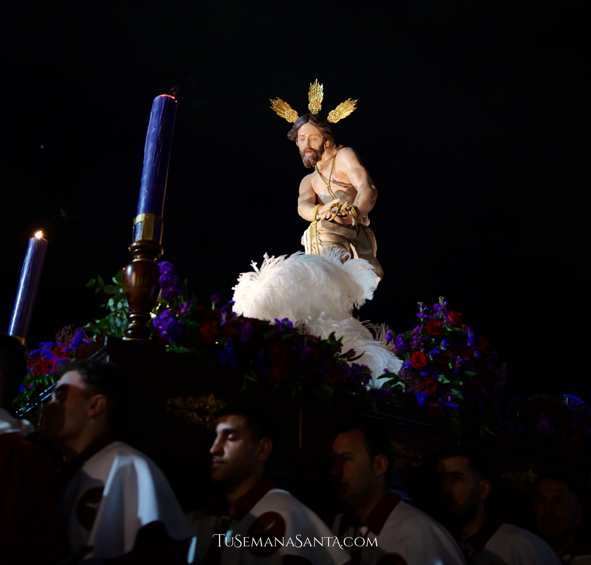 Los tres primeros años, hasta 2001, la imagen procesionó con cuatro cirios blancos en hachones de hierro forjado negro. Desde 2002 alterna entre esos hachones, otros cuatro morados o rojos sobre soportes de madera torneados o de forja negra o cuatro faroles de hierro forjado negro.